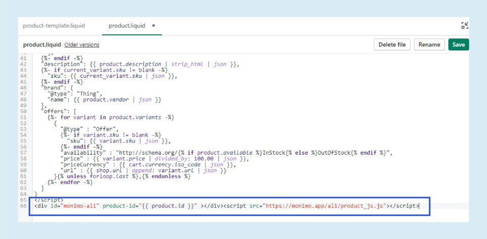 4. Find the following line of code: <div id=”monimo-ali” product-id=”{{ product.id }}” ></div><script src=”https://monimo.app/ali/product_js.js”></script>