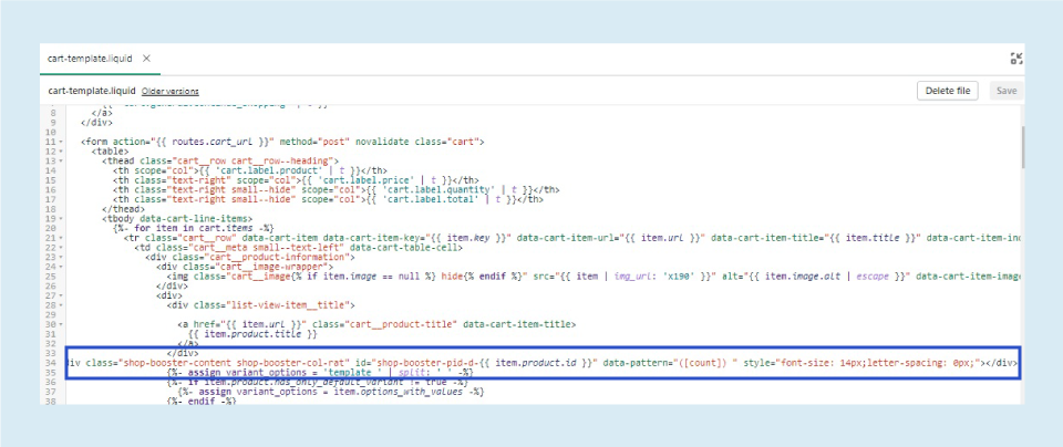 - Find and delete the following code: <div class=”shop-booster-content shop-booster-col-rat” id=”shop-booster-pid-d-{{ item.product.id }}” data-pattern=”([count]) ” style=”font-size: 14px;letter-spacing: 0px;”></div>