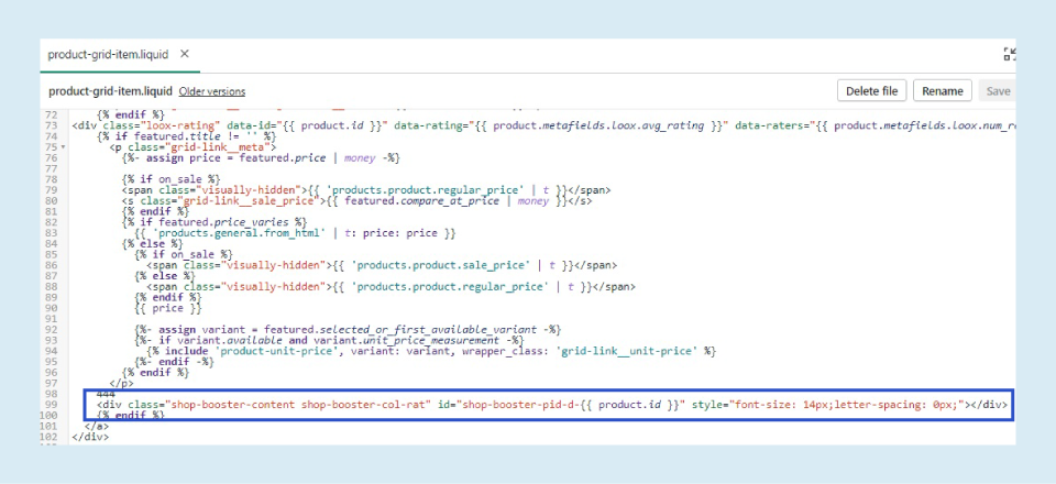 - Find and delete the following code: <div class=”shop-booster-content shop-booster-col-rat” id=”shop-booster-pid-d-{{ product.id }}” data-pattern=”([count]) ” style=”font-size: 14px;letter-spacing: 0px;”></div>