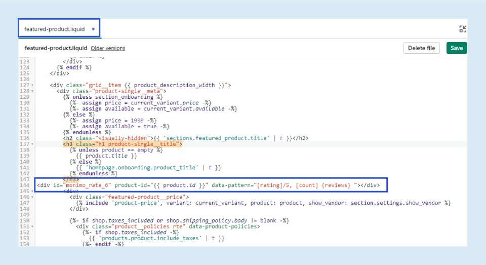 - Delete the following code: <div id=”monimo_rate_6″ product-id=”{{ product.id }}” data-pattern=”[rating]/5, [count] {reviews} “></div>